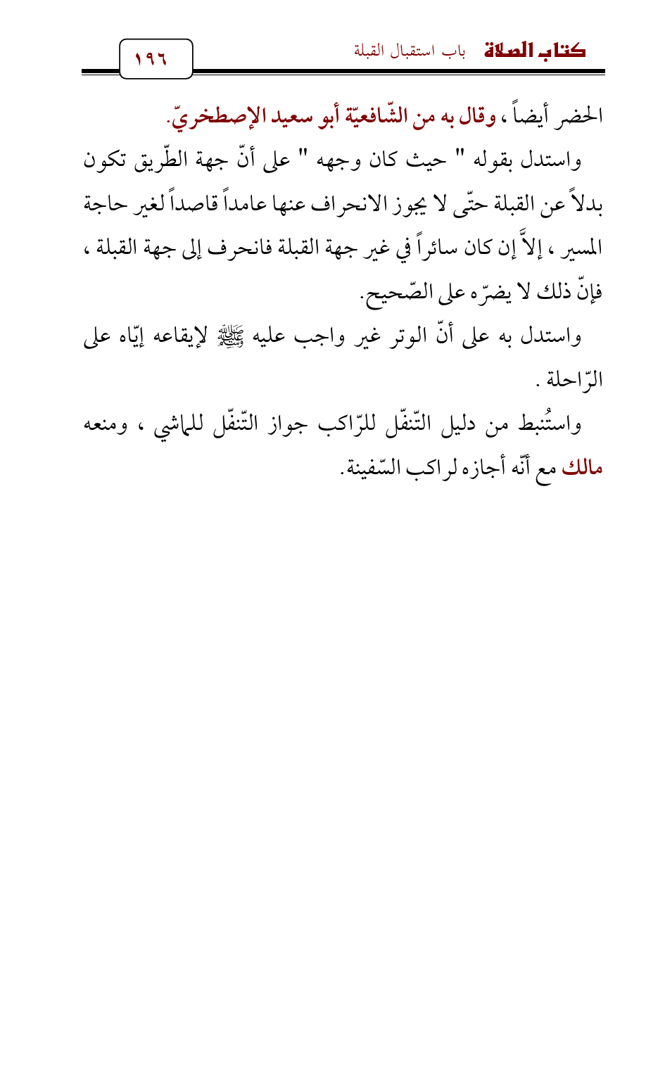 واستدل بقوله " حيث كان وجهه " على أنّ جهة الطّريق تكون بدلاً عن القبلة حتّى لا يجوز الانحراف عنها عامداً قاصداً لغير حاجة المسير , إلاَّ إن كان سائراً في غير جهة القبلة فانحرف إلى جهة القبلة , فإنّ ذلك لا يضرّه على الصّحيح.