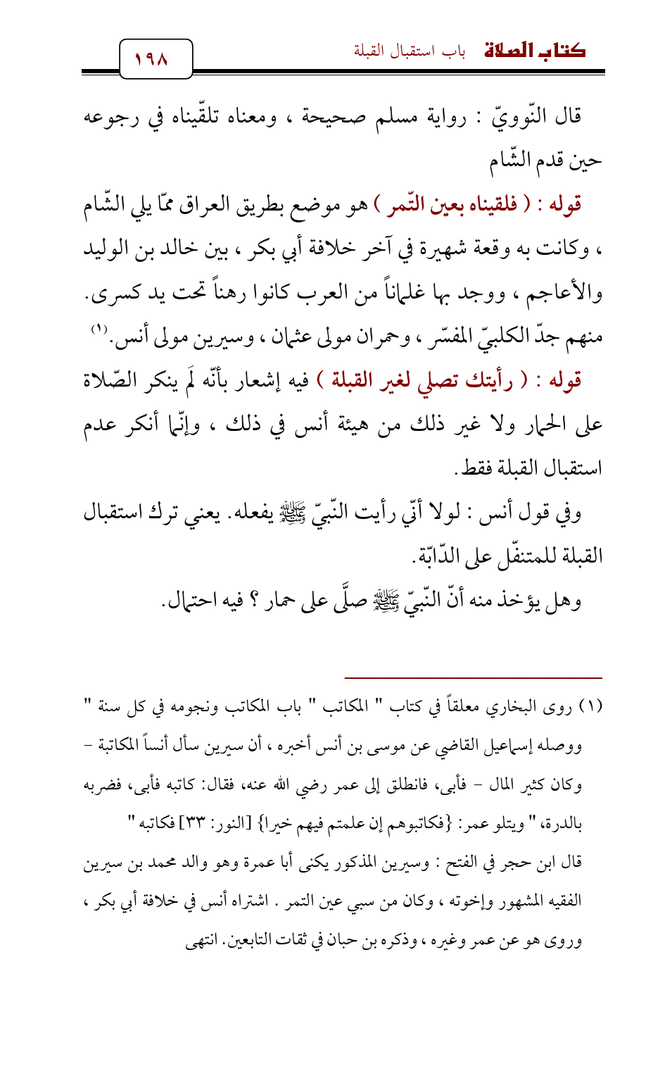 قوله: (فلقيناه بعين التّمر) هو موضع بطريق العراق ممّا يلي الشّام , وكانت به وقعة شهيرة في آخر خلافة أبي بكر , بين خالد بن الوليد والأعاجم، ووجد بها غلماناً من العرب كانوا رهناً تحت يد كسرى. منهم جدّ الكلبيّ المفسّر , وحمران مولى عثمان , وسيرين مولى أنس. (¬1)