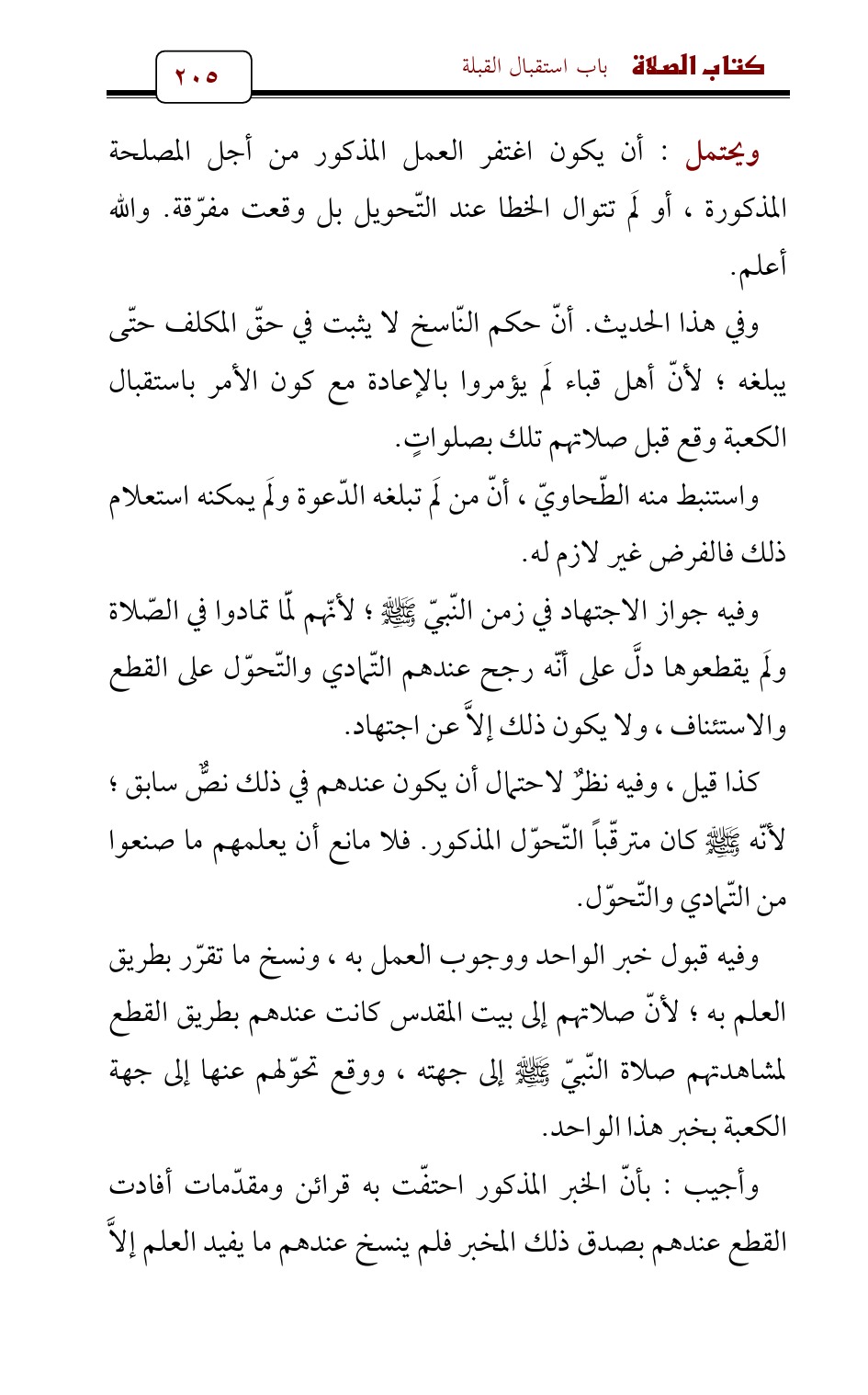 وفي هذا الحديث. أنّ حكم النّاسخ لا يثبت في حقّ المكلف حتّى يبلغه؛ لأنّ أهل قباء لَم يؤمروا بالإعادة مع كون الأمر باستقبال الكعبة وقع قبل صلاتهم تلك بصلواتٍ.