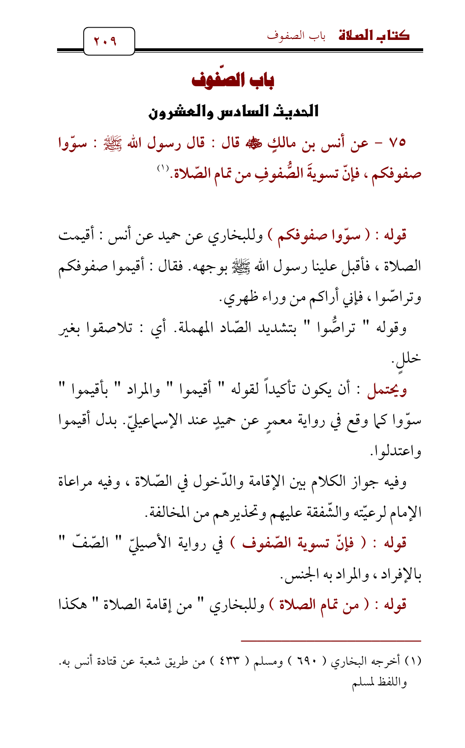 75 - عن أنس بن مالكٍ - رضي الله عنه - قال: قال رسول الله - صلى الله عليه وسلم -: سوّوا صفوفكم , فإنّ تسويةَ الصُّفوفِ من تمام الصّلاة. (¬1)