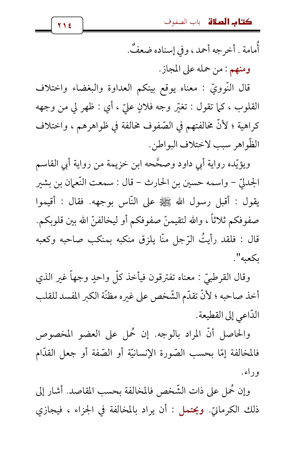 ويؤيّده رواية أبي داود وصحَّحه ابن خزيمة من رواية أبي القاسم الجدليّ - واسمه حسين بن الحارث - قال: سمعت النّعمان بن بشير يقول: أقبل رسول الله - صلى الله عليه وسلم - على النّاس بوجهه. فقال: أقيموا صفوفكم ثلاثاً، والله لتقيمنّ صفوفكم أو ليخالفنّ الله بين قلوبكم. قال: فلقد رأيتُ الرّجل منّا يلزق منكبه بمنكب صاحبه وكعبه بكعبه ".