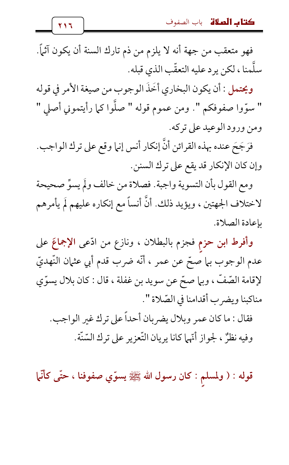 وأفرط ابن حزمٍ فجزم بالبطلان، ونازع من ادّعى الإجماعَ على عدم الوجوب بما صحّ عن عمر , أنّه ضرب قدم أبي عثمان النّهديّ لإقامة الصّفّ، وبما صحّ عن سويد بن غفلة , قال: كان بلال يسوّي مناكبنا ويضرب أقدامنا في الصّلاة ".