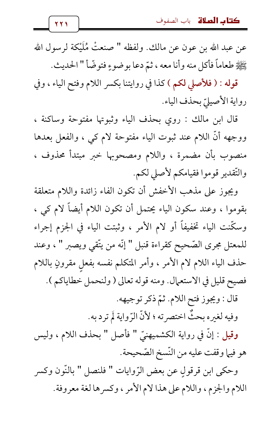 قال ابن مالك: روي بحذف الياء وثبوتها مفتوحة وساكنة، ووجهه أنّ اللام عند ثبوت الياء مفتوحة لام كي , والفعل بعدها منصوب بأن مضمرة , واللام ومصحوبها خبر مبتدأ محذوف , والتّقدير قوموا فقيامكم لأصلي لكم.