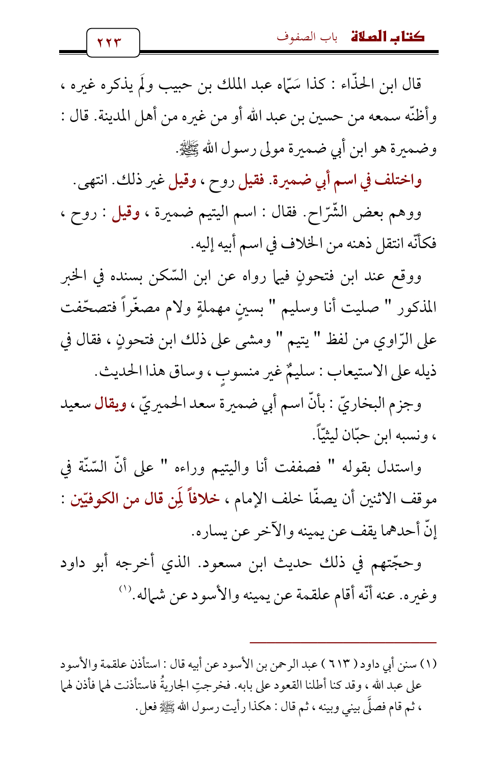 وحجّتهم في ذلك حديث ابن مسعود. الذي أخرجه أبو داود وغيره. عنه أنّه أقام علقمة عن يمينه والأسود عن شماله. (¬1)