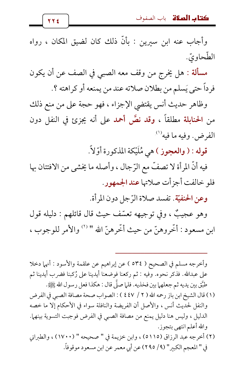 (¬1) قال الشيخ ابن باز رحمه الله (2/ 447): الصواب صحة مصافة الصبي في الفرض والنفل لحديث أنس , والأصل أن الفريضة والنافلة سواء في الأحكام إلا ما خصه الدليل , وليس هنا دليل يمنع من مصافة الصبي في الفرض فوجبت التسوية بينهما. والله أعلم انتهى بتجوز.