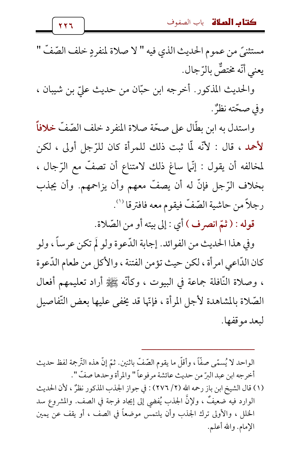 واستدل به ابن بطّال على صحّة صلاة المنفرد خلف الصّفّ خلافاً لأحمد، قال: لأنّه لَمّا ثبت ذلك للمرأة كان للرّجل أولى، لكن لمخالفه أن يقول: إنّما ساغ ذلك لامتناع أن تصفّ مع الرّجال، بخلاف الرّجل فإنّ له أن يصفّ معهم وأن يزاحمهم. وأن يجذب رجلاً من حاشية الصّفّ فيقوم معه فافترقا (¬1).
