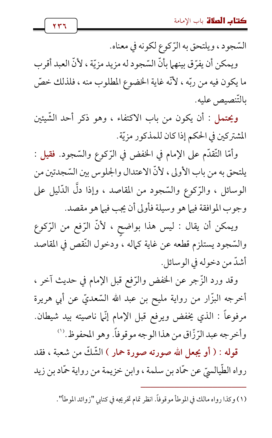 وقد ورد الزّجر عن الخفض والرّفع قبل الإمام في حديث آخر , أخرجه البزّار من رواية مليح بن عبد الله السّعديّ عن أبي هريرة مرفوعاً: الذي يخفض ويرفع قبل الإمام إنّما ناصيته بيد شيطان. وأخرجه عبد الرّزّاق من هذا الوجه موقوفاً. وهو المحفوظ. (¬1)