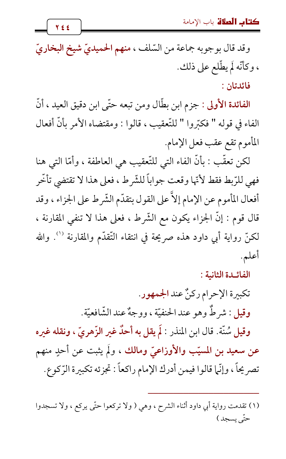 لكن تعقّب: بأنّ الفاء التي للتّعقيب هي العاطفة، وأمّا التي هنا فهي للرّبط فقط لأنّها وقعت جواباً للشّرط، فعلى هذا لا تقتضي تأخّر أفعال المأموم عن الإمام إلاَّ على القول بتقدّم الشّرط على الجزاء، وقد قال قوم: إنّ الجزاء يكون مع الشّرط، فعلى هذا لا تنفي المقارنة، لكنّ رواية أبي داود هذه صريحة في انتقاء التّقدّم والمقارنة (¬1). والله أعلم.