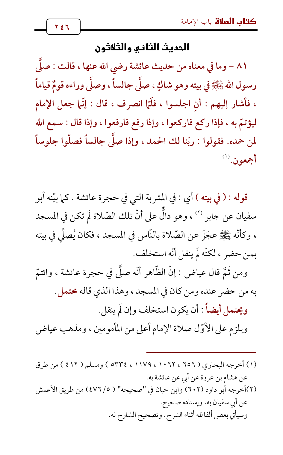 81 - وما في معناه من حديث عائشة رضي الله عنها , قالت: صلَّى رسول الله - صلى الله عليه وسلم - في بيته وهو شاكٍ , صلَّى جالساً , وصلَّى وراءه قومٌ قياماً , فأشار إليهم: أنِ اجلسوا , فلَمّا انصرف , قال: إنّما جعل الإمام ليؤتمّ به , فإذا ركع فاركعوا , وإذا رفع فارفعوا , وإذا قال: سمع الله لمن حمده. فقولوا: ربّنا لك الحمد , وإذا صلَّى جالساً فصلّوا جلوساً أجمعون. (¬1)