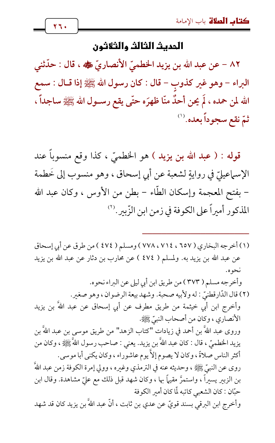 82 - عن عبد الله بن يزيد الخطميّ الأنصاريّ - رضي الله عنه - , قال: حدّثني البراء - وهو غير كذوبٍ - قال: كان رسول الله - صلى الله عليه وسلم - إذا قال: سمع الله لمن حمده , لَم يحن أحدٌ منّا ظهرَه حتّى يقع رسول الله - صلى الله عليه وسلم - ساجداً , ثمّ نقع سجوداً بعده. (¬1)