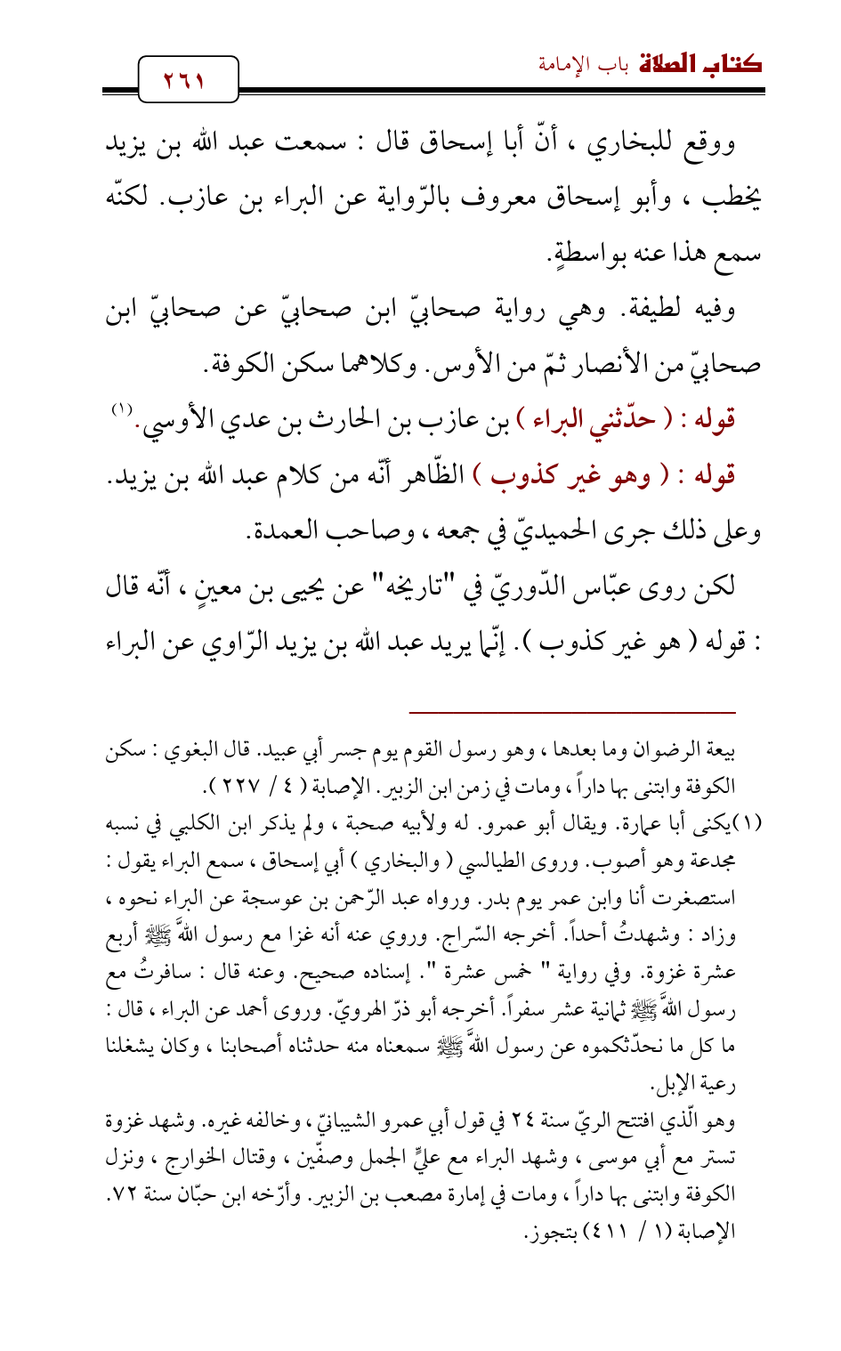 (¬1) يكنى أبا عمارة. ويقال أبو عمرو. له ولأبيه صحبة، ولم يذكر ابن الكلبي في نسبه مجدعة وهو أصوب. وروى الطيالسي (والبخاري) أبي إسحاق، سمع البراء يقول: استصغرت أنا وابن عمر يوم بدر. ورواه عبد الرّحمن بن عوسجة عن البراء نحوه، وزاد: وشهدتُ أحداً. أخرجه السّراج. وروي عنه أنه غزا مع رسول اللَّه - صلى الله عليه وسلم - أربع عشرة غزوة. وفي رواية " خمس عشرة ". إسناده صحيح. وعنه قال: سافرتُ مع رسول اللَّه - صلى الله عليه وسلم - ثمانية عشر سفراً. أخرجه أبو ذرّ الهرويّ. وروى أحمد عن البراء، قال: ما كل ما نحدّثكموه عن رسول اللَّه - صلى الله عليه وسلم - سمعناه منه حدثناه أصحابنا، وكان يشغلنا رعية الإبل.