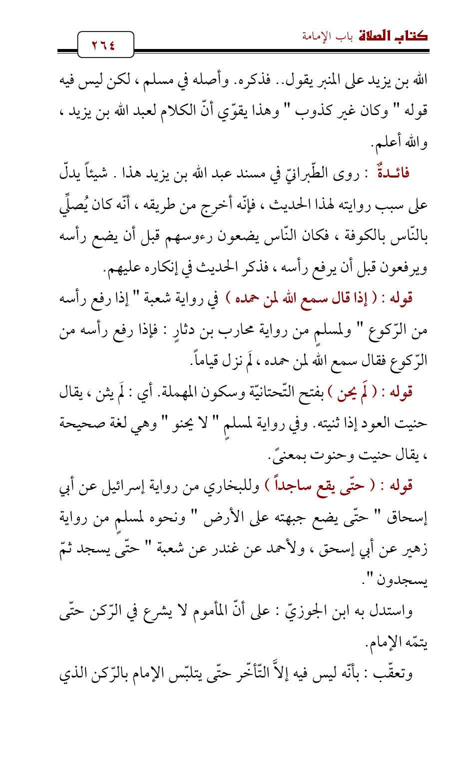 فائدةٌ: روى الطّبرانيّ في مسند عبد الله بن يزيد هذا. شيئاً يدلّ على سبب روايته لهذا الحديث، فإنّه أخرج من طريقه , أنّه كان يُصلِّي بالنّاس بالكوفة , فكان النّاس يضعون رءوسهم قبل أن يضع رأسه ويرفعون قبل أن يرفع رأسه، فذكر الحديث في إنكاره عليهم.