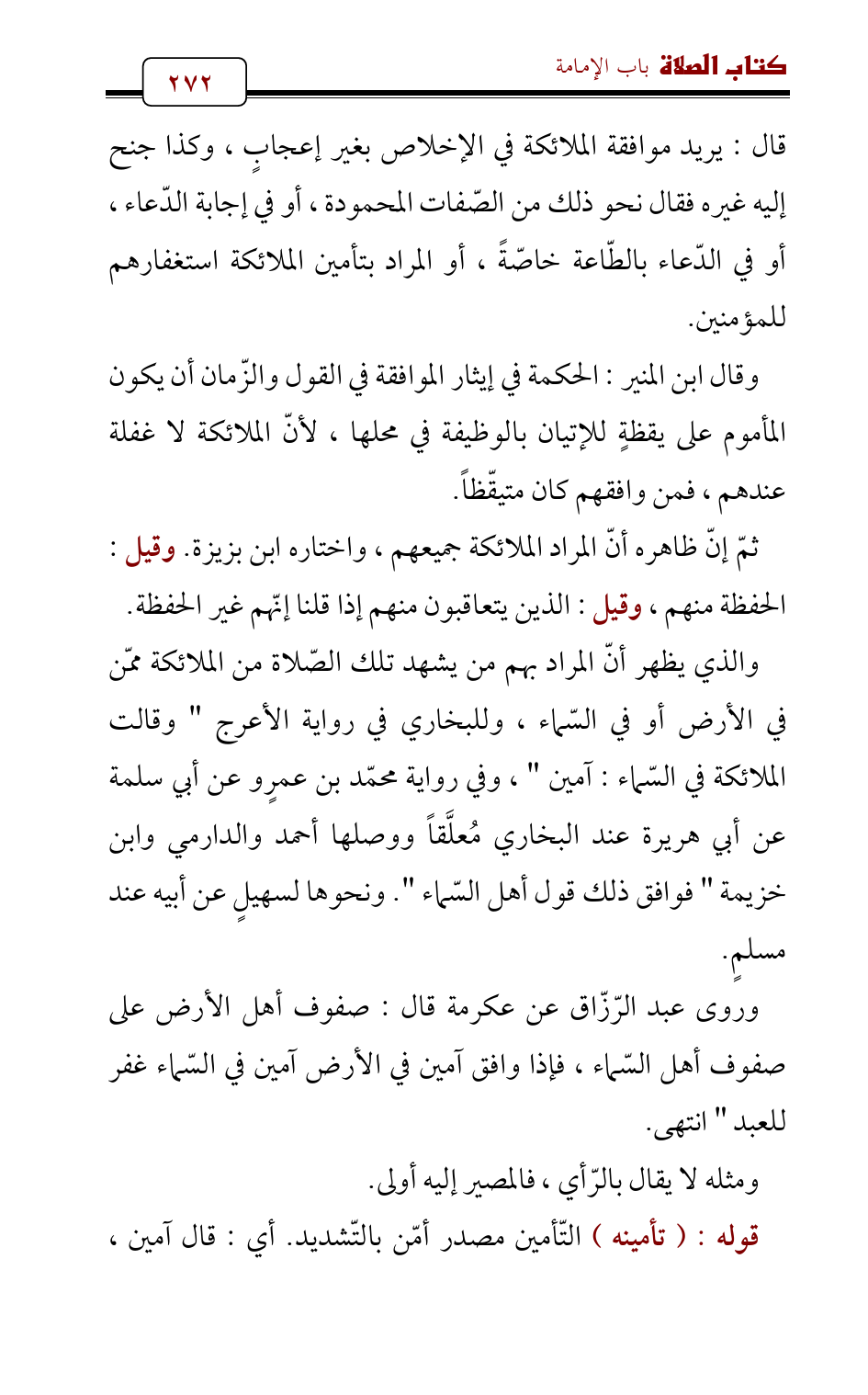 قال: يريد موافقة الملائكة في الإخلاص بغير إعجابٍ، وكذا جنح إليه غيره فقال نحو ذلك من الصّفات المحمودة، أو في إجابة الدّعاء، أو في الدّعاء بالطّاعة خاصّةً، أو المراد بتأمين الملائكة استغفارهم للمؤمنين.