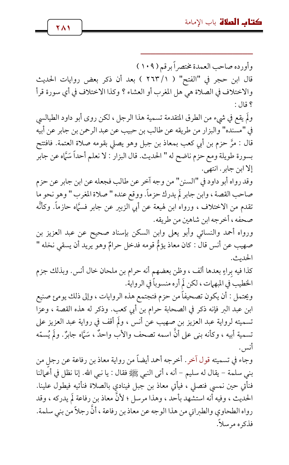 ورواه أحمد والنسائي وأبو يعلى وابن السكن بإسناد صحيح عن عبد العزيز بن صهيب عن أنس قال: كان معاذ يؤمُّ قومه فدخل حرامٌ وهو يريد أن يسقي نخله " الحديث.
