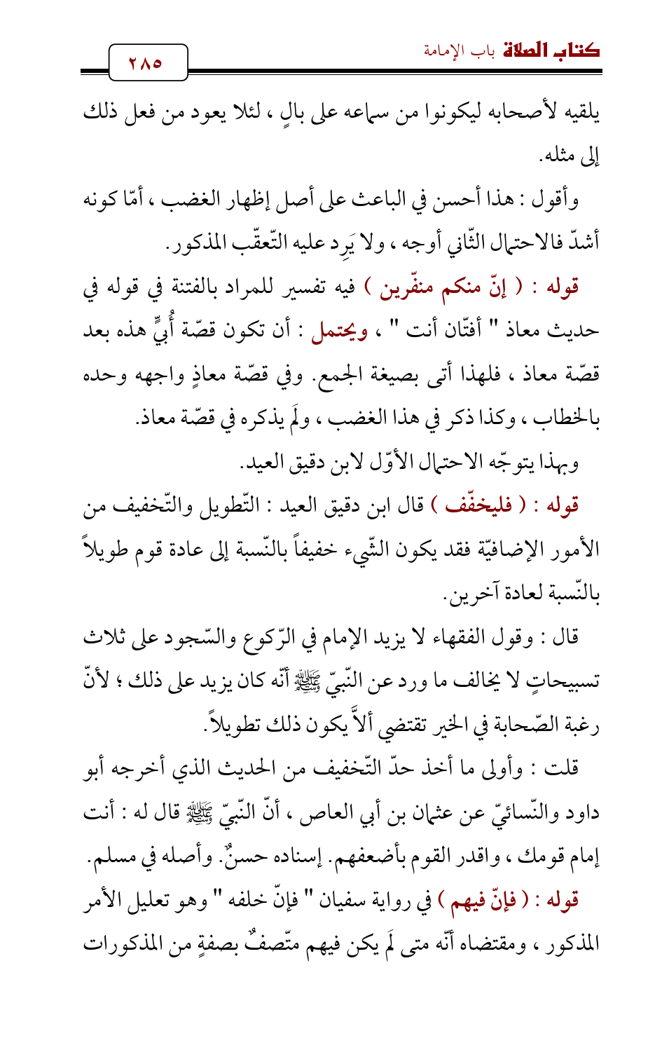 قلت: وأولى ما أخذ حدّ التّخفيف من الحديث الذي أخرجه أبو داود والنّسائيّ عن عثمان بن أبي العاص , أنّ النّبيّ - صلى الله عليه وسلم - قال له: أنت إمام قومك، واقدر القوم بأضعفهم. إسناده حسنٌ. وأصله في مسلم.