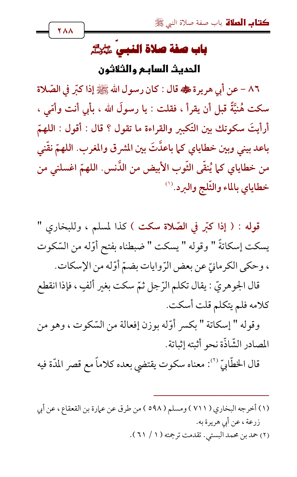 86 - عن أبي هريرة - رضي الله عنه - قال: كان رسول الله - صلى الله عليه وسلم - إذا كبّر في الصّلاة سكت هُنيَّةً قبل أن يقرأ , فقلت: يا رسولَ الله , بأبي أنت وأمّي , أرأيتَ سكوتك بين التّكبير والقراءة ما تقول؟ قال: أقول: اللهمّ باعد بيني وبين خطاياي كما باعدَّتَ بين المشرق والمغرب. اللهمّ نقّني من خطاياي كما يُنقّى الثّوب الأبيض من الدَّنس. اللهمّ اغسلني من خطاياي بالماء والثّلج والبرد. (¬1)