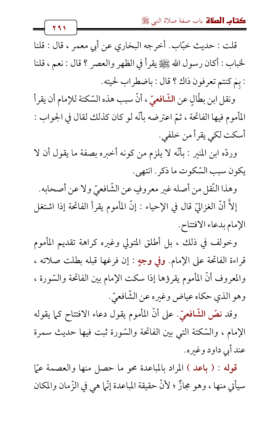 وخولف في ذلك، بل أطلق المتولي وغيره كراهة تقديم المأموم قراءة الفاتحة على الإمام. وفي وجهٍ: إن فرغها قبله بطلت صلاته، والمعروف أنّ المأموم يقرؤها إذا سكت الإمام بين الفاتحة والسّورة، وهو الذي حكاه عياض وغيره عن الشّافعيّ.