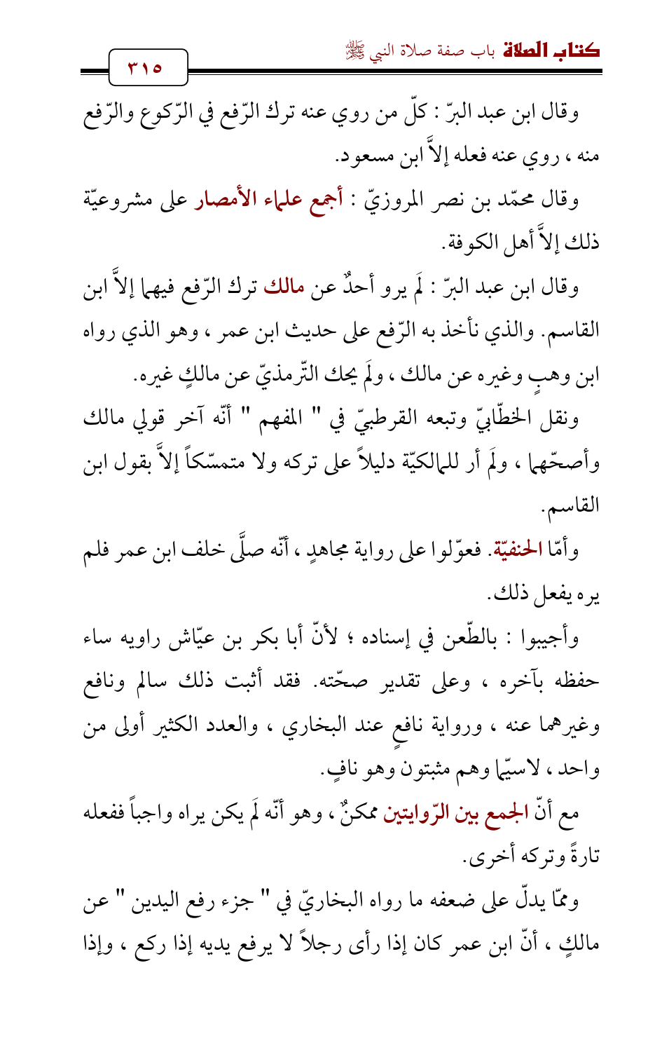 وقال ابن عبد البرّ: لَم يرو أحدٌ عن مالك ترك الرّفع فيهما إلاَّ ابن القاسم. والذي نأخذ به الرّفع على حديث ابن عمر، وهو الذي رواه ابن وهبٍ وغيره عن مالك، ولَم يحك التّرمذيّ عن مالكٍ غيره.