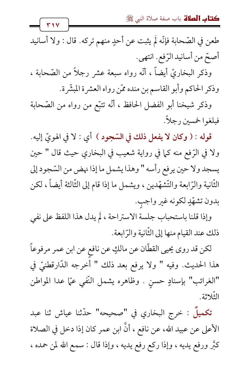 تكميلٌ: خرج البخاري في " صحيحه " حدّثنا عياش ثنا عبد الأعلى عن عبيد الله، عن نافع، أنَّ ابن عمر كان إذا دخل في الصلاة كبَّر ورفع يديه، وإذا ركع رفع يديه، وإذا قال: سمع الله لمن حمده،