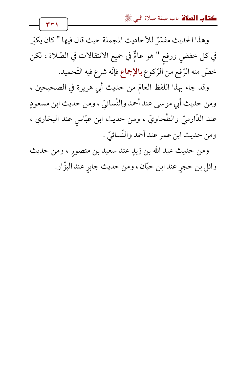وهذا الحديث مفسّرٌ للأحاديث المجملة حيث قال فيها " كان يكبّر في كل خفضٍ ورفعٍ " هو عامٌّ في جميع الانتقالات في الصّلاة، لكن خصّ منه الرّفع من الرّكوع بالإجماع فإنّه شرع فيه التّحميد.
