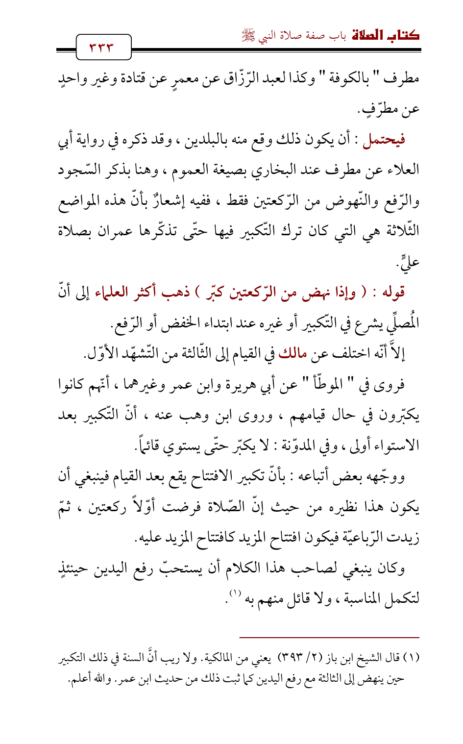 (¬1) قال الشيخ ابن باز (2/ 393) يعني من المالكية. ولا ريب أنَّ السنة في ذلك التكبير حين ينهض إلى الثالثة مع رفع اليدين كما ثبت ذلك من حديث ابن عمر. والله أعلم.