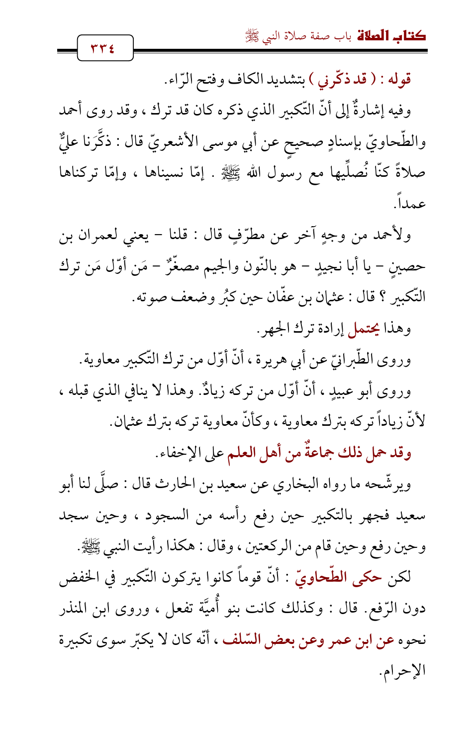 وفيه إشارةٌ إلى أنّ التّكبير الذي ذكره كان قد ترك، وقد روى أحمد والطّحاويّ بإسنادٍ صحيحٍ عن أبي موسى الأشعريّ قال: ذكَّرَنا عليٌّ صلاةً كنّا نُصلِّيها مع رسول الله - صلى الله عليه وسلم -. إمّا نسيناها , وإمّا تركناها عمداً.
