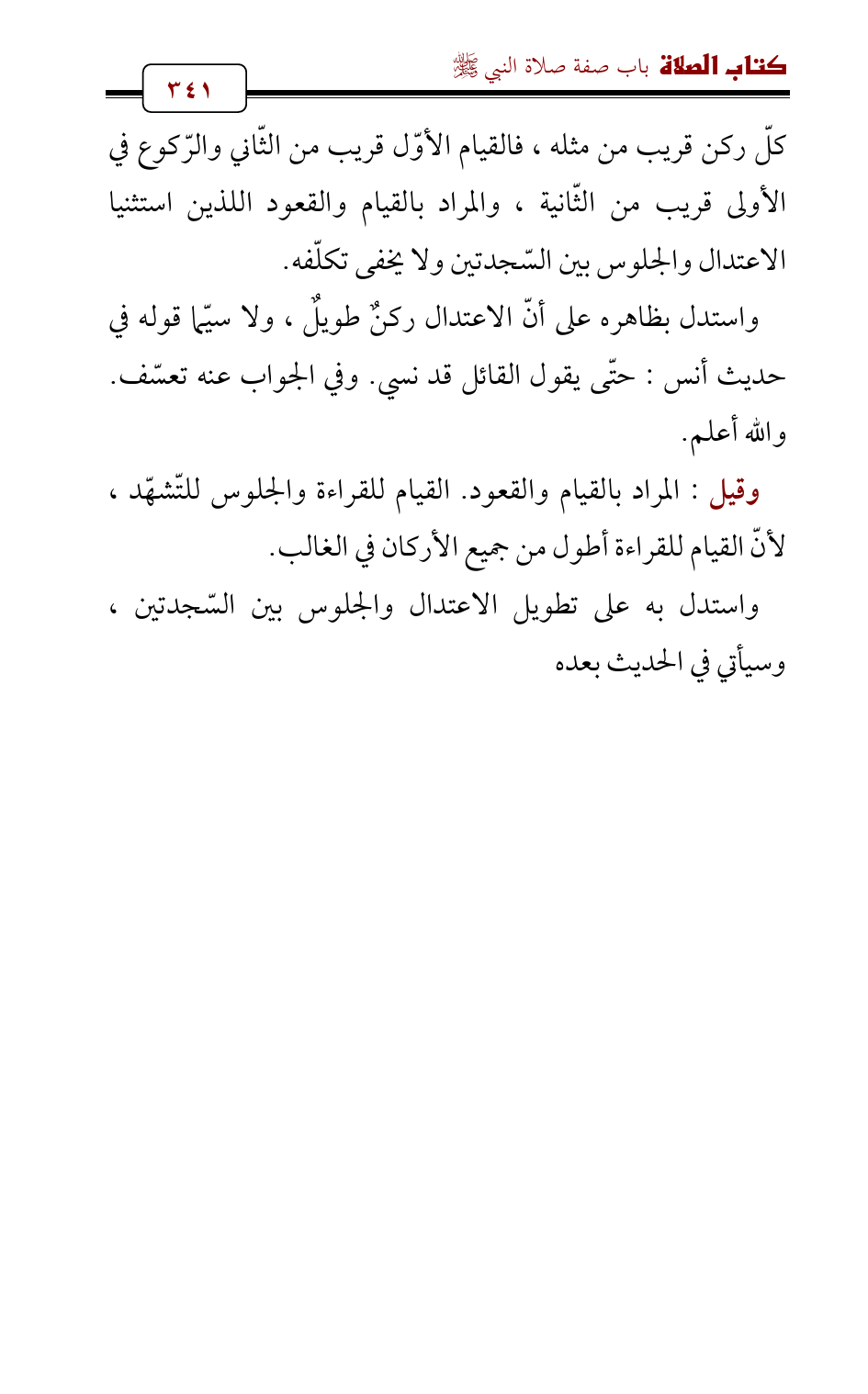 واستدل بظاهره على أنّ الاعتدال ركنٌ طويلٌ , ولا سيّما قوله في حديث أنس: حتّى يقول القائل قد نسي. وفي الجواب عنه تعسّف. والله أعلم.