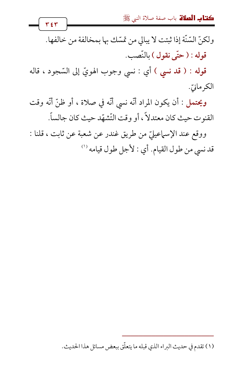 ويحتمل: أن يكون المراد أنّه نسي أنّه في صلاة، أو ظنّ أنّه وقت القنوت حيث كان معتدلاً , أو وقت التّشهّد حيث كان جالساً.