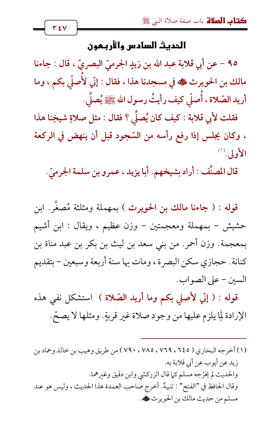 95 - عن أبي قلابة عبد الله بن زيدٍ الجرميّ البصريّ , قال: جاءنا مالك بن الحويرث - رضي الله عنه - في مسجدنا هذا , فقال: إنّي لأُصلّي بكم , وما أريد الصّلاة , أُصلّي كيف رأيتُ رسول الله - صلى الله عليه وسلم - يُصلِّي.
