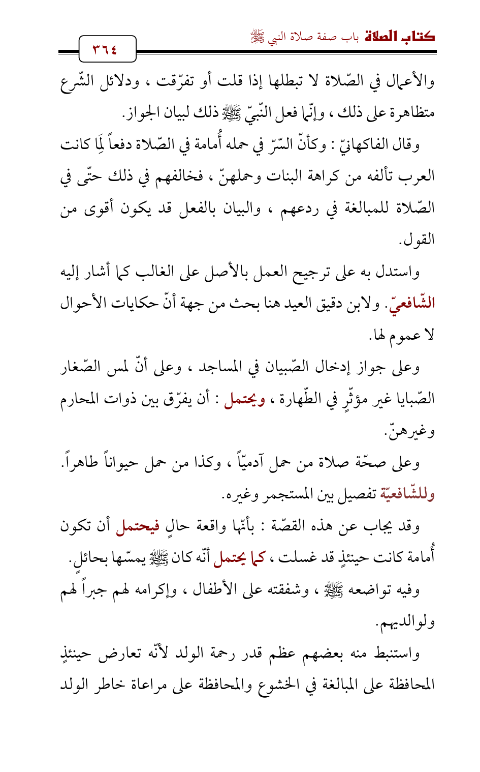 وقال الفاكهانيّ: وكأنّ السّرّ في حمله أُمامة في الصّلاة دفعاً لِمَا كانت العرب تألفه من كراهة البنات وحملهنّ، فخالفهم في ذلك حتّى في الصّلاة للمبالغة في ردعهم، والبيان بالفعل قد يكون أقوى من القول.
