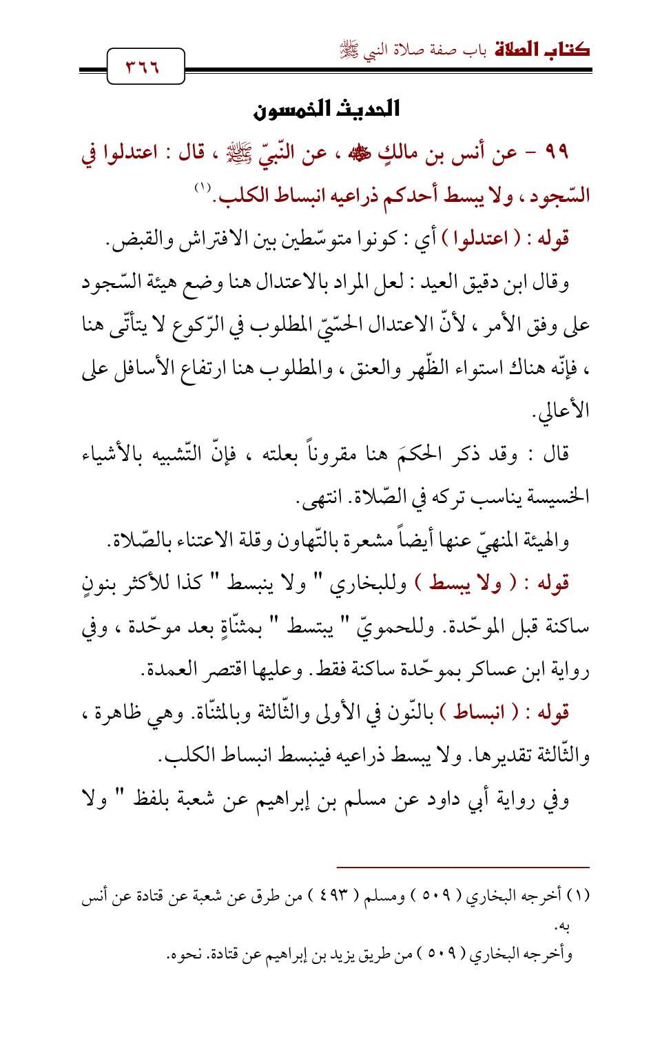 99 - عن أنس بن مالكٍ - رضي الله عنه - , عن النّبيّ - صلى الله عليه وسلم - , قال: اعتدلوا في السّجود , ولا يبسط أحدكم ذراعيه انبساط الكلب. (¬1)