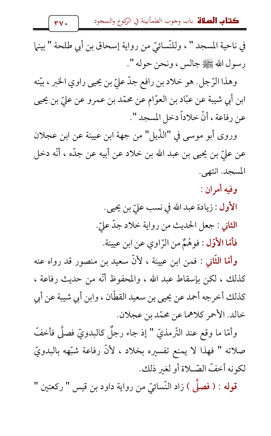 وأمّا الثّاني: فمن ابن عيينة , لأنّ سعيد بن منصور قد رواه عنه كذلك , لكن بإسقاط عبد الله، والمحفوظ أنّه من حديث رفاعة، كذلك أخرجه أحمد عن يحيى بن سعيد القطّان , وابن أبي شيبة عن أبي خالد. الأحمر كلاهما عن محمّد بن عجلان.