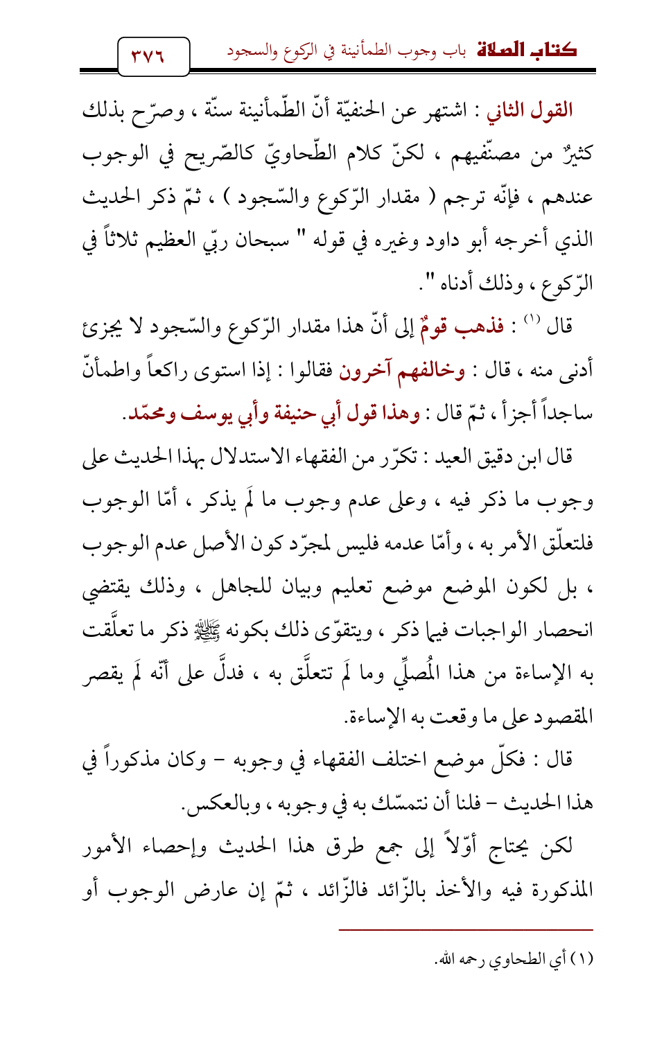 القول الثاني: اشتهر عن الحنفيّة أنّ الطّمأنينة سنّة، وصرّح بذلك كثيرٌ من مصنّفيهم، لكنّ كلام الطّحاويّ كالصّريح في الوجوب عندهم، فإنّه ترجم (مقدار الرّكوع والسّجود)، ثمّ ذكر الحديث الذي أخرجه أبو داود وغيره في قوله " سبحان ربّي العظيم ثلاثاً في الرّكوع , وذلك أدناه ".