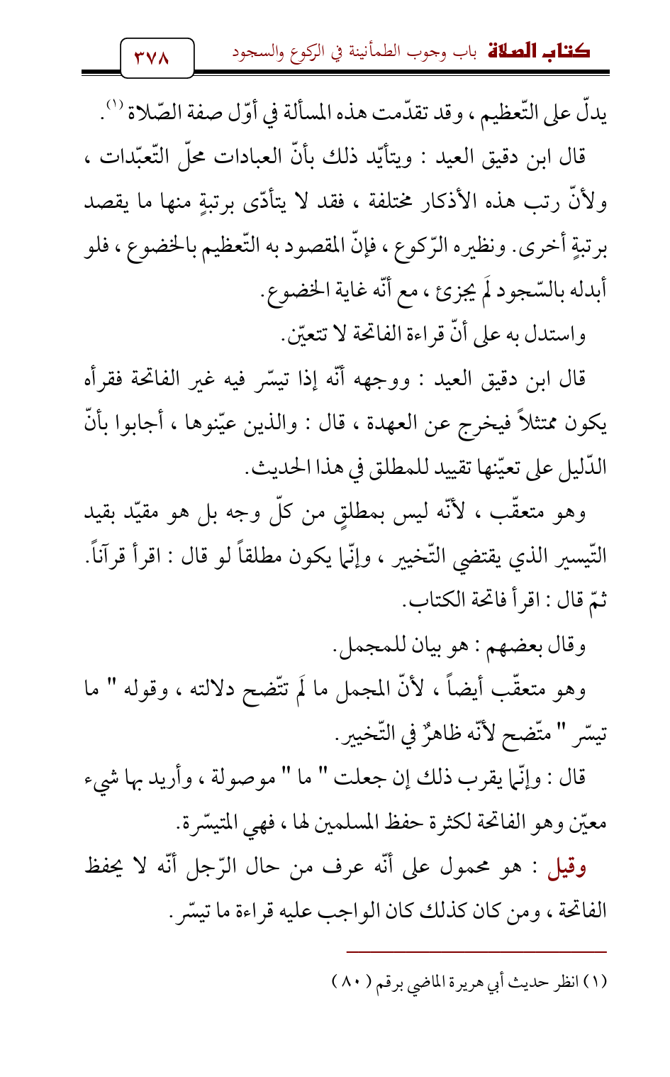 قال ابن دقيق العيد: ووجهه أنّه إذا تيسّر فيه غير الفاتحة فقرأه يكون ممتثلاً فيخرج عن العهدة، قال: والذين عيّنوها , أجابوا بأنّ الدّليل على تعيّنها تقييد للمطلق في هذا الحديث.