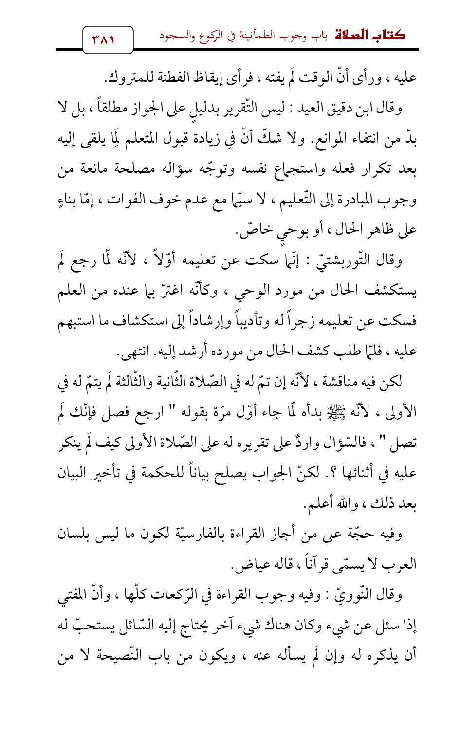 لكن فيه مناقشة، لأنّه إن تمّ له في الصّلاة الثّانية والثّالثة لَم يتمّ له في الأولى، لأنّه - صلى الله عليه وسلم - بدأه لَمّا جاء أوّل مرّة بقوله " ارجع فصل فإنّك لَم تصل " , فالسّؤال واردٌ على تقريره له على الصّلاة الأولى كيف لَم ينكر عليه في أثنائها؟. لكنّ الجواب يصلح بياناً للحكمة في تأخير البيان بعد ذلك، والله أعلم.