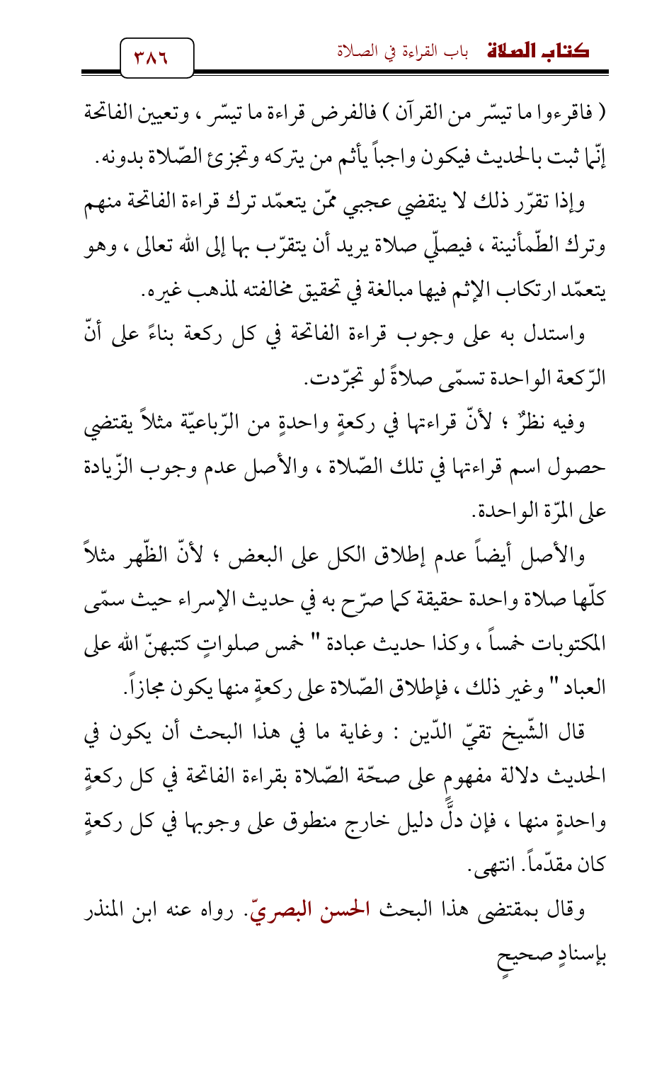 قال الشّيخ تقيّ الدّين: وغاية ما في هذا البحث أن يكون في الحديث دلالة مفهومٍ على صحّة الصّلاة بقراءة الفاتحة في كل ركعةٍ واحدةٍ منها، فإن دلَّ دليل خارج منطوق على وجوبها في كل ركعةٍ كان مقدّماً. انتهى.