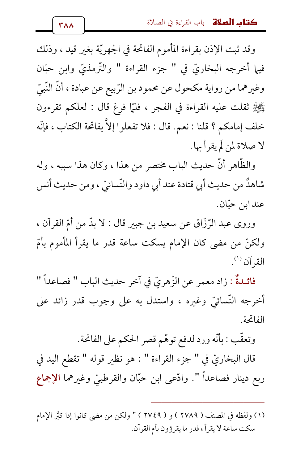 وقد ثبت الإذن بقراءة المأموم الفاتحة في الجهريّة بغير قيد، وذلك فيما أخرجه البخاريّ في " جزء القراءة " والتّرمذيّ وابن حبّان وغيرهما من رواية مكحول عن محمود بن الرّبيع عن عبادة , أنّ النّبيّ - صلى الله عليه وسلم - ثقلت عليه القراءة في الفجر، فلمّا فرغ قال: لعلكم تقرءون خلف إمامكم؟ قلنا: نعم. قال: فلا تفعلوا إلاَّ بفاتحة الكتاب، فإنّه لا صلاة لمن لَم يقرأ بها.