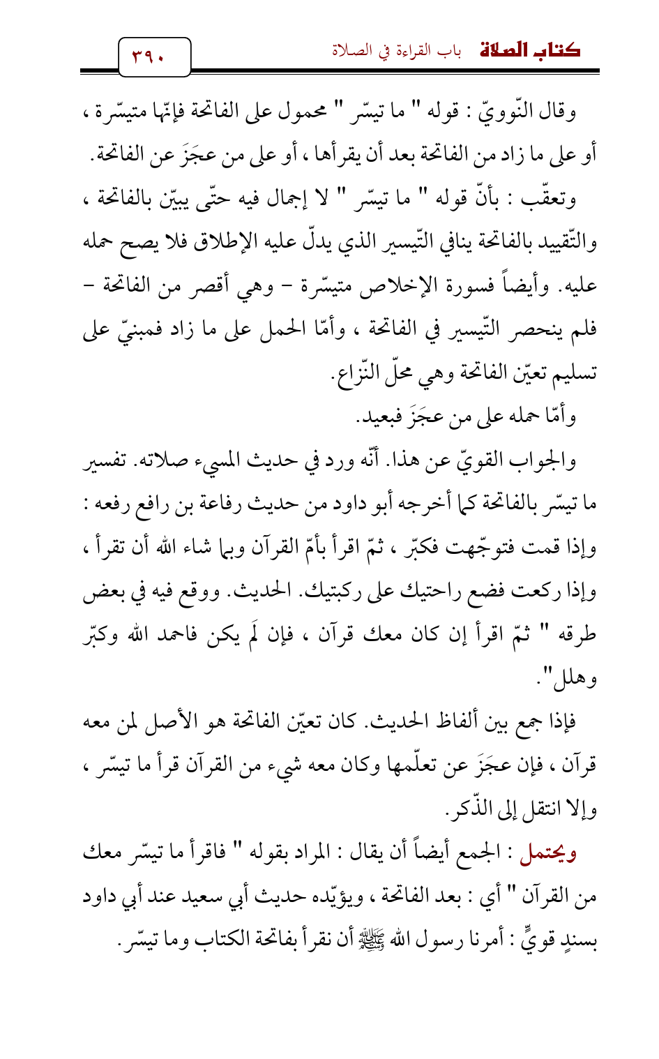 وقال النّوويّ: قوله " ما تيسّر " محمول على الفاتحة فإنّها متيسّرة، أو على ما زاد من الفاتحة بعد أن يقرأها، أو على من عجَزَ عن الفاتحة.