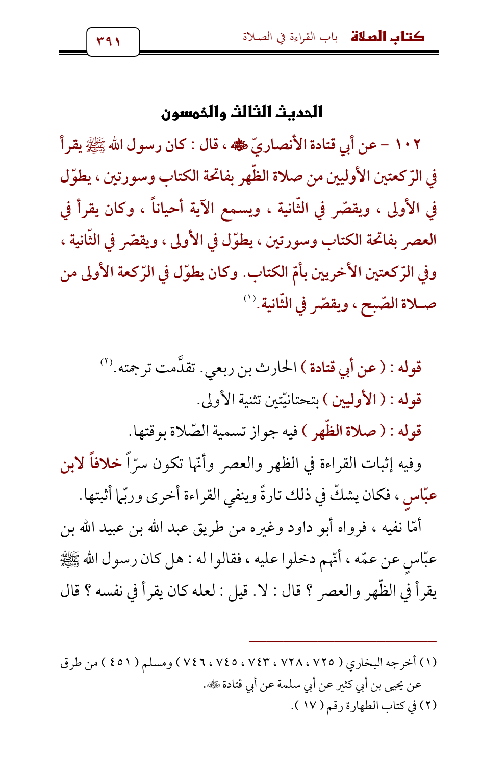 102 - عن أبي قتادة الأنصاريّ - رضي الله عنه - , قال: كان رسول الله - صلى الله عليه وسلم - يقرأ في الرّكعتين الأوليين من صلاة الظّهر بفاتحة الكتاب وسورتين , يطوّل في الأولى , ويقصّر في الثّانية , ويسمع الآية أحياناً، وكان يقرأ في العصر بفاتحة الكتاب وسورتين , يطوّل في الأولى , ويقصّر في الثّانية , وفي الرّكعتين الأخريين بأمّ الكتاب. وكان يطوّل في الرّكعة الأولى من صلاة الصّبح , ويقصّر في الثّانية. (¬1)