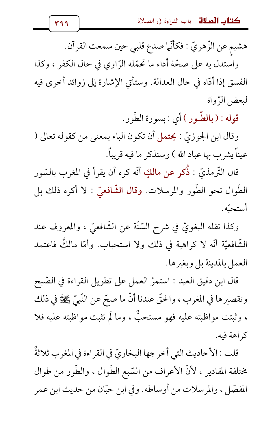 قال التّرمذيّ: ذُكر عن مالكٍ أنّه كره أن يقرأ في المغرب بالسّور الطّوال نحو الطّور والمرسلات. وقال الشّافعيّ: لا أكره ذلك بل أستحبّه.