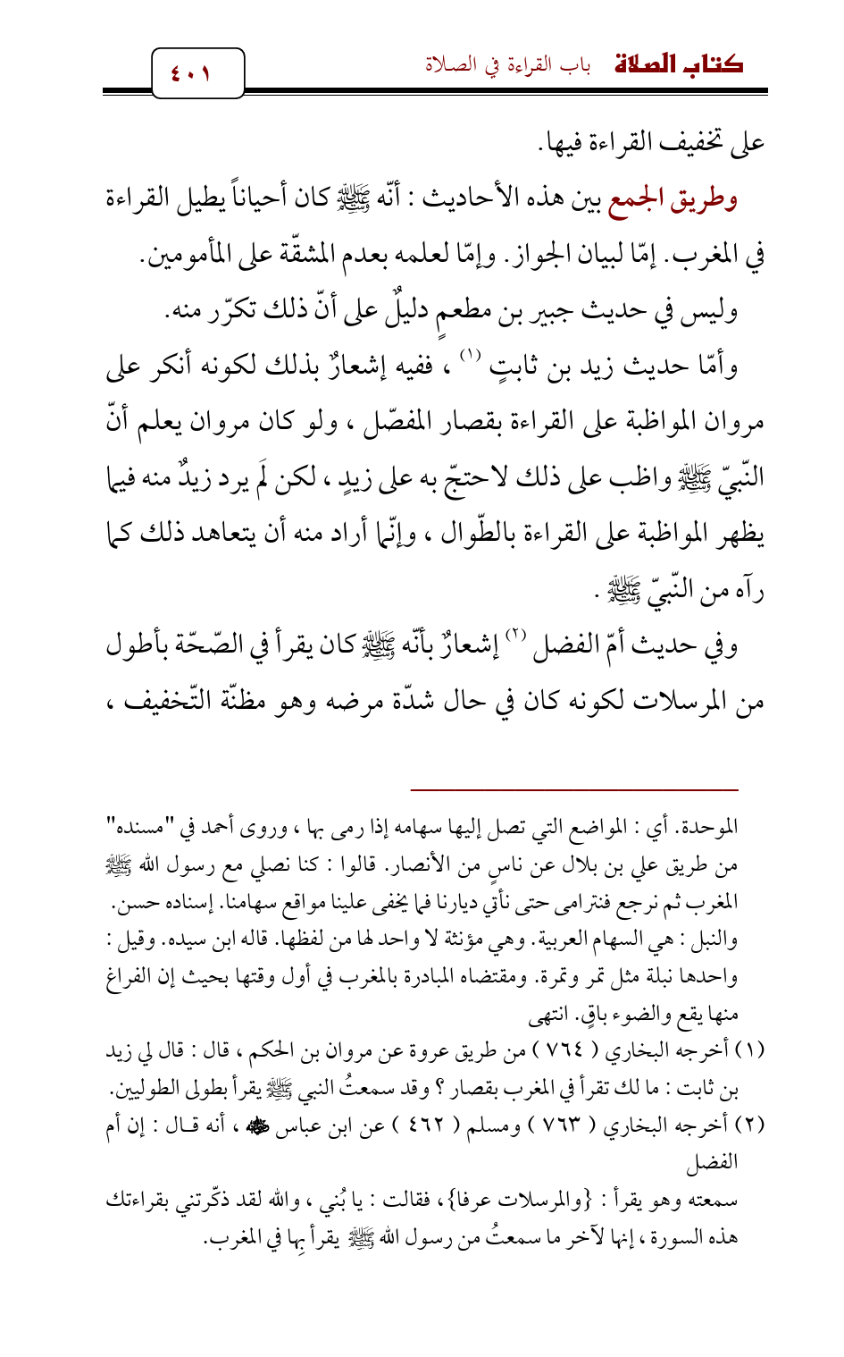 وطريق الجمع بين هذه الأحاديث: أنّه - صلى الله عليه وسلم - كان أحياناً يطيل القراءة في المغرب. إمّا لبيان الجواز. وإمّا لعلمه بعدم المشقّة على المأمومين.