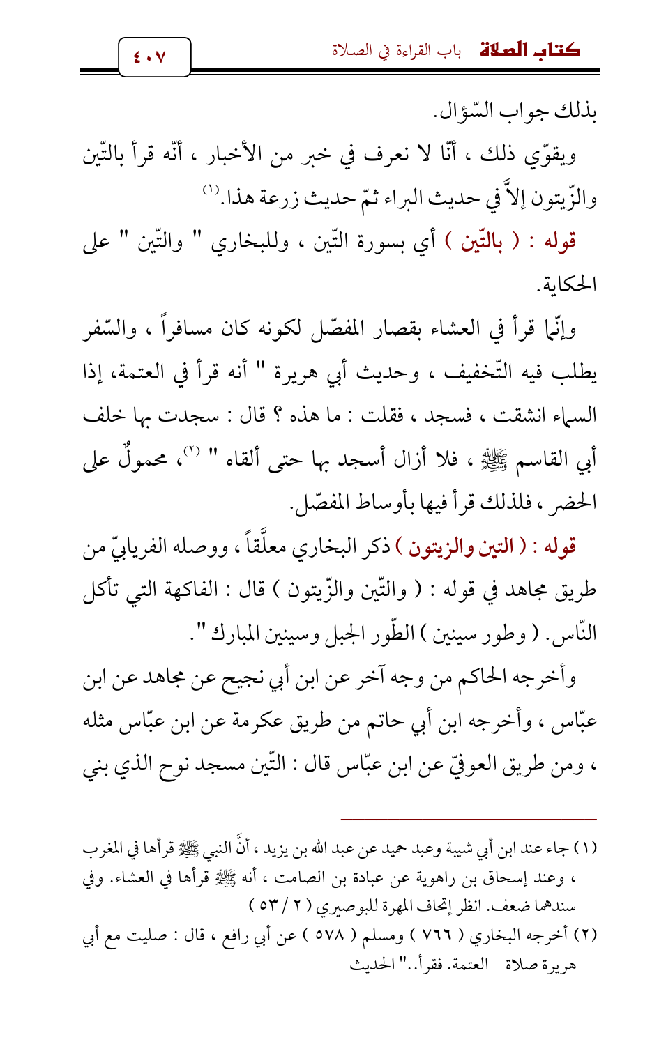 ويقوّي ذلك , أنّا لا نعرف في خبر من الأخبار , أنّه قرأ بالتّين والزّيتون إلاَّ في حديث البراء ثمّ حديث زرعة هذا. (¬1)