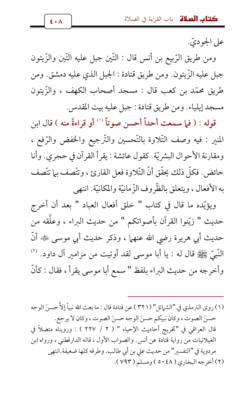 ويؤيّده ما قال في كتاب " خلق أفعال العباد " بعد أن أخرج حديث " زيّنوا القرآن بأصواتكم " من حديث البراء , وعلَّقه من حديث أبي هريرة رضي الله عنهما، وذكر حديث أبي موسى - رضي الله عنه - أنّ النّبيّ - صلى الله عليه وسلم - قال له: يا أبا موسى لقد أوتيت من مزامير آل داود. (¬2) وأخرجه من حديث البراء بلفظ " سمع أبا موسى يقرأ , فقال: كأنّ هذا من