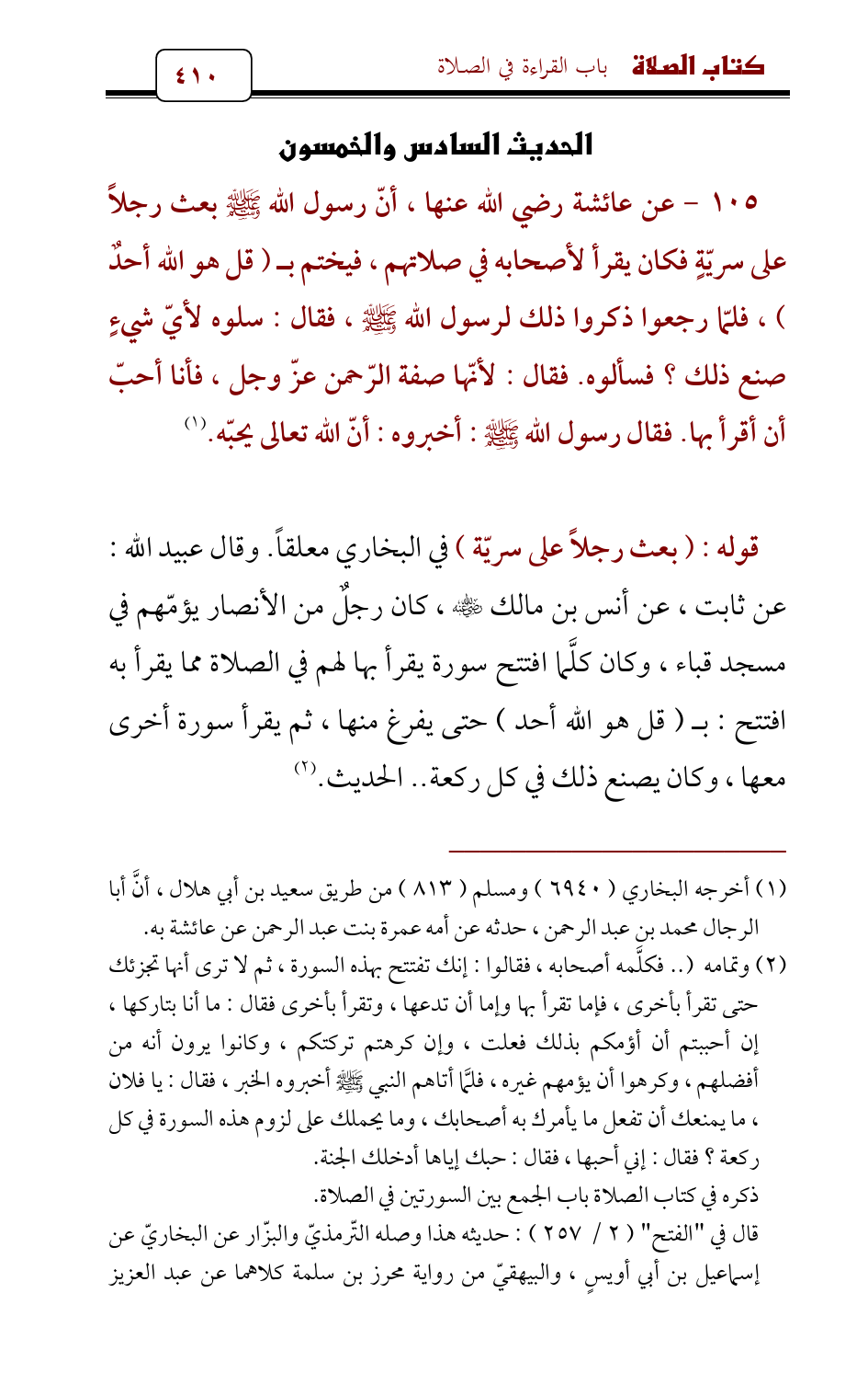 105 - عن عائشة رضي الله عنها , أنّ رسول الله - صلى الله عليه وسلم - بعث رجلاً على سريّةٍ فكان يقرأ لأصحابه في صلاتهم , فيختم بـ (قل هو الله أحدٌ) , فلمّا رجعوا ذكروا ذلك لرسول الله - صلى الله عليه وسلم - , فقال: سلوه لأيّ شيءٍ صنع ذلك؟ فسألوه. فقال: لأنّها صفة الرّحمن عزّ وجل , فأنا أحبّ أن أقرأ بها. فقال رسول الله - صلى الله عليه وسلم -: أخبروه: أنّ الله تعالى يحبّه. (¬1)