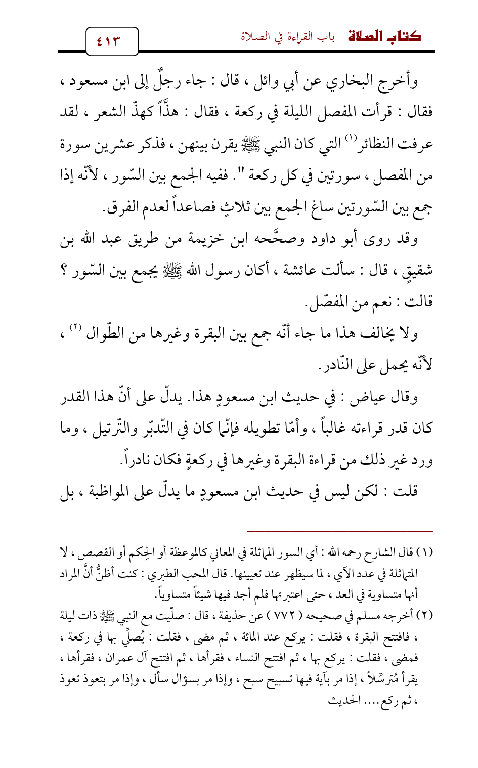 (¬2) أخرجه مسلم في صحيحه (772) عن حذيفة، قال: صلّيت مع النبي - صلى الله عليه وسلم - ذات ليلة، فافتتح البقرة، فقلت: يركع عند المائة، ثم مضى، فقلت: يُصلِّي بها في ركعة، فمضى، فقلت: يركع بها، ثم افتتح النساء، فقرأها، ثم افتتح آل عمران، فقرأها، يقرأ مُترسِّلاً، إذا مر بآية فيها تسبيح سبح، وإذا مر بسؤال سأل، وإذا مر بتعوذ تعوذ، ثم ركع .... الحديث