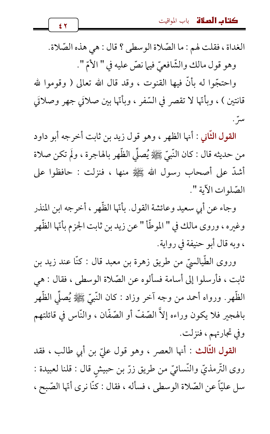 القول الثّاني: أنها الظهر , وهو قول زيد بن ثابت أخرجه أبو داود من حديثه قال: كان النّبيّ - صلى الله عليه وسلم - يُصلِّي الظّهر بالهاجرة، ولَم تكن صلاة أشدّ على أصحاب رسول الله - صلى الله عليه وسلم - منها، فنزلت: حافظوا على الصّلوات الآية ".