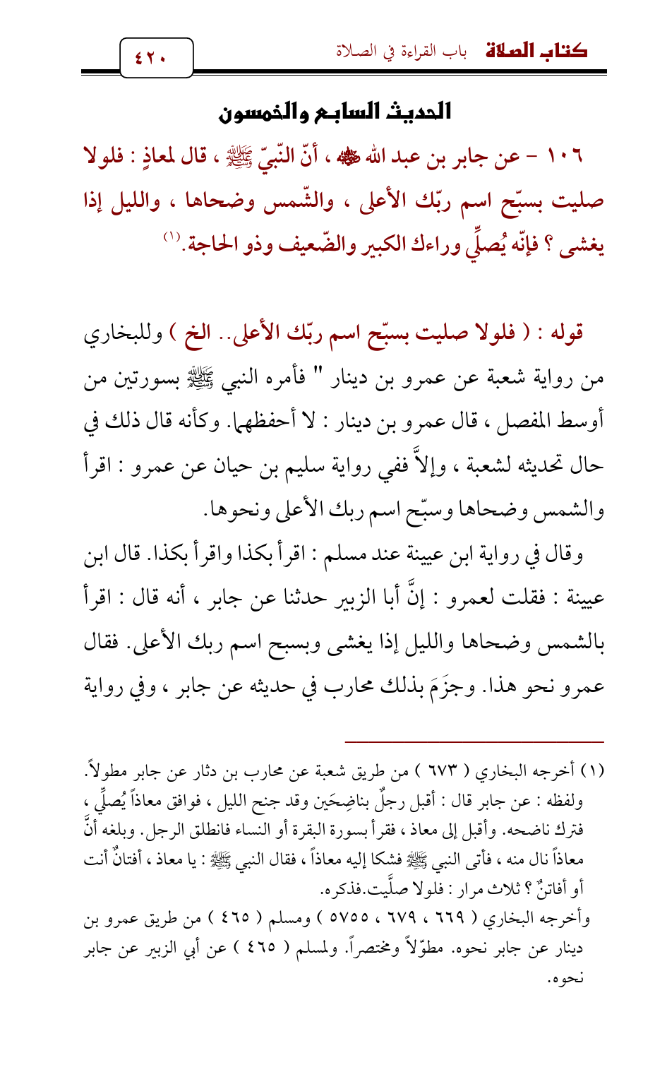 106 - عن جابر بن عبد الله - رضي الله عنه - , أنّ النّبيّ - صلى الله عليه وسلم - , قال لمعاذٍ: فلولا صليت بسبّح اسم ربّك الأعلى , والشّمس وضحاها , والليل إذا يغشى؟ فإنّه يُصلِّي وراءك الكبير والضّعيف وذو الحاجة. (¬1)