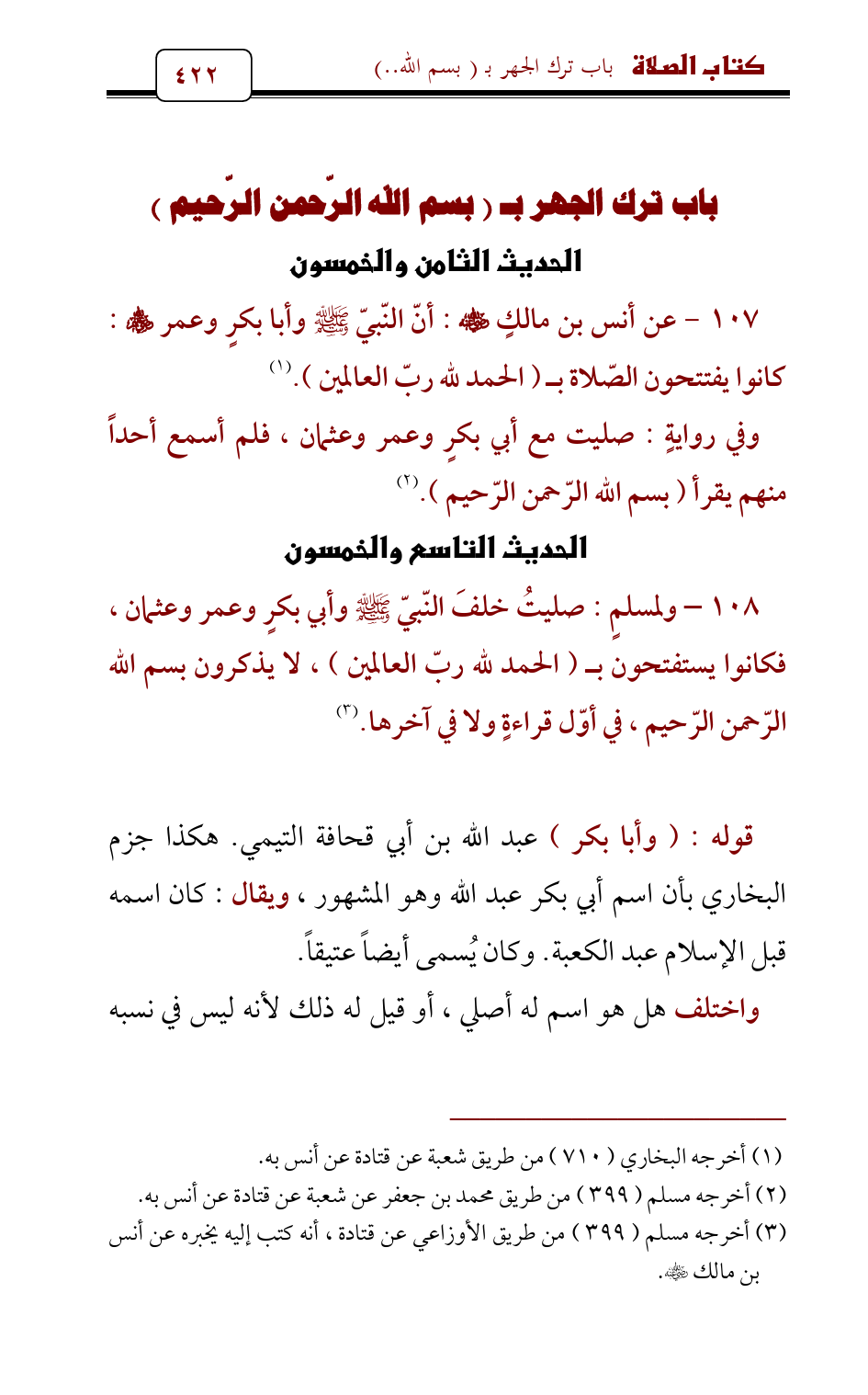 107 - عن أنس بن مالكٍ - رضي الله عنه -: أنّ النّبيّ - صلى الله عليه وسلم - وأبا بكرٍ وعمر - رضي الله عنهم -: كانوا يفتتحون الصّلاة بـ (الحمد لله ربّ العالمين). (¬1)