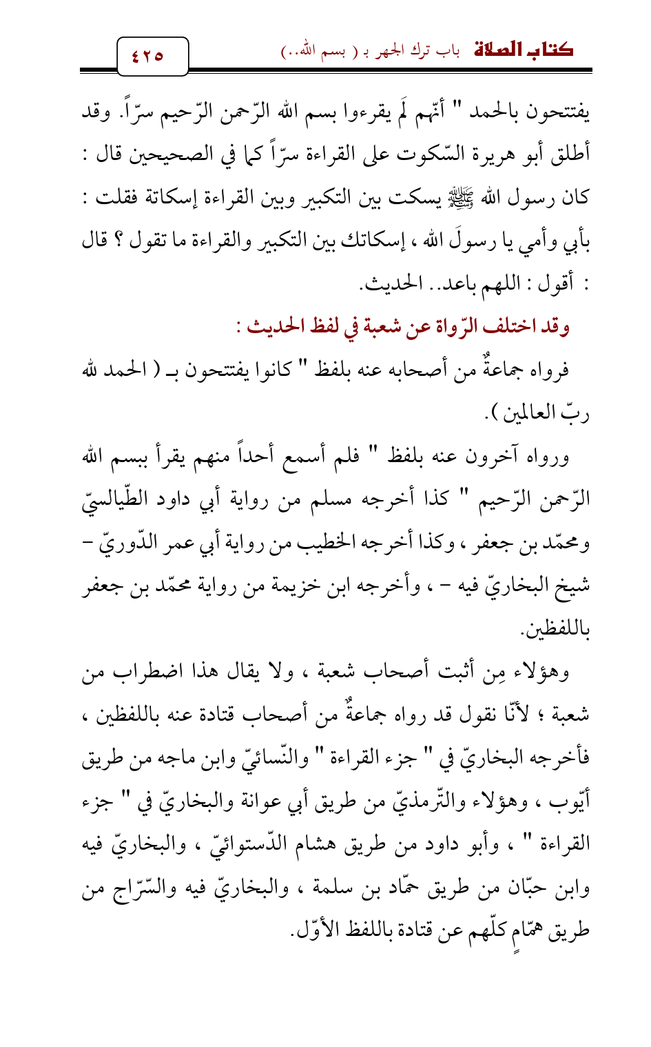 ورواه آخرون عنه بلفظ " فلم أسمع أحداً منهم يقرأ ببِسْمِ اللَّهِ الرَّحْمَنِ الرَّحِيمِ " كذا أخرجه مسلم من رواية أبي داود الطّيالسيّ ومحمّد بن جعفر، وكذا أخرجه الخطيب من رواية أبي عمر الدّوريّ - شيخ البخاريّ فيه -، وأخرجه ابن خزيمة من رواية محمّد بن جعفر باللفظين.