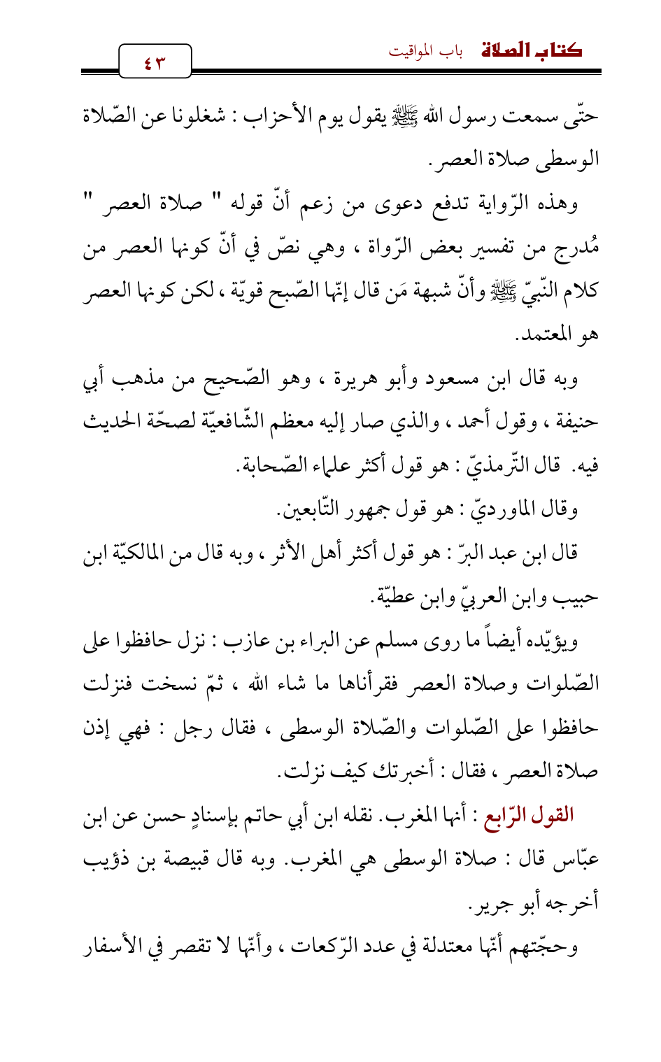 وهذه الرّواية تدفع دعوى من زعم أنّ قوله " صلاة العصر " مُدرج من تفسير بعض الرّواة , وهي نصّ في أنّ كونها العصر من كلام النّبيّ - صلى الله عليه وسلم - وأنّ شبهة مَن قال إنّها الصّبح قويّة، لكن كونها العصر هو المعتمد.